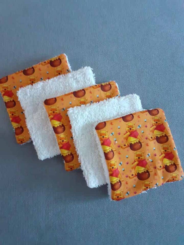 Les lingettes mesurent environ 10x10 cm, un coté tissus coton, un coté éponge et passent facilement en machine.