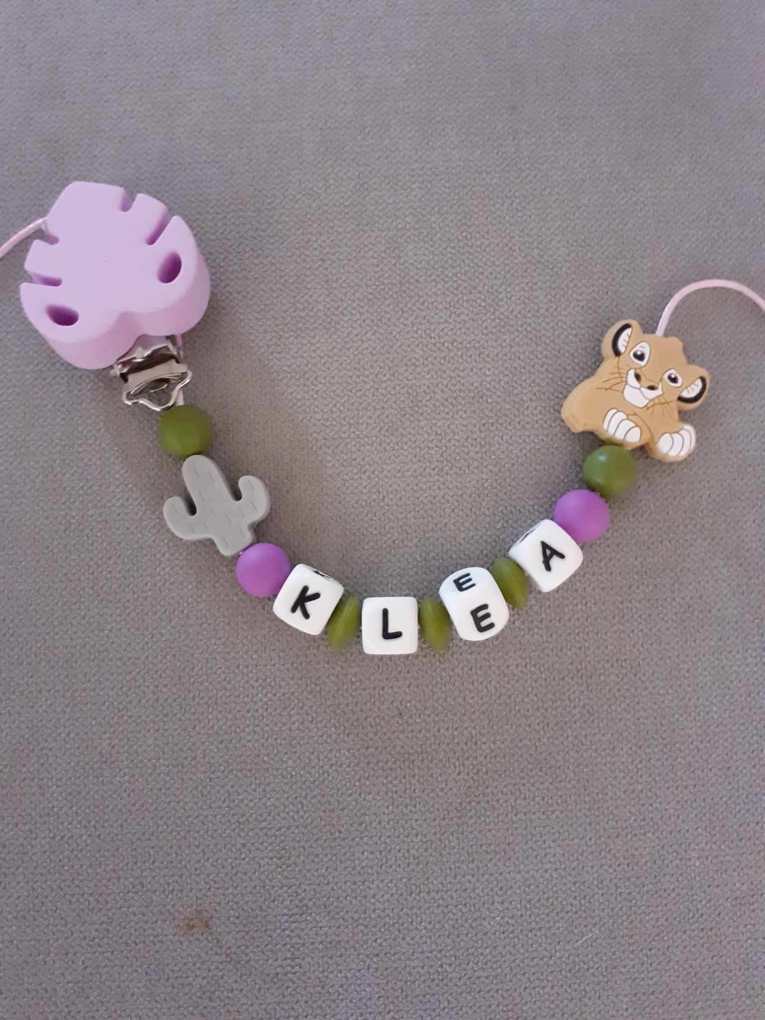 Attache-tétine simba, perles en silicone, clips en silicone, matériel aux normes, longueur de l'attache-tétine 22 cm(du bout du clips a la boucle), choix du prénom, si prénom de plus de 6 lettres, je suis dans l'obligation d'enlever des perles. Si le prénom est trop long et dépasse la norme, je serais dans l'obligation de refuser la commande. Vous pouvez également passer commande d'un attache-tétine sans prénom, dans ce cas chaque perles lettres sera remplacer par une perle rond du coloris du modèle et sera réparti de façon harmonieuse. Les attaches-tétines sont nettoyés avec du savon doux avant envoi.